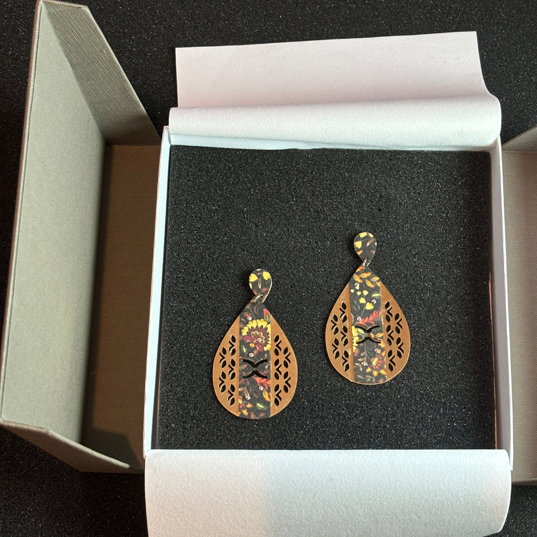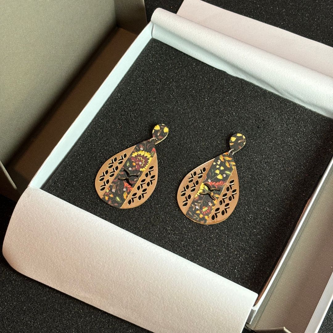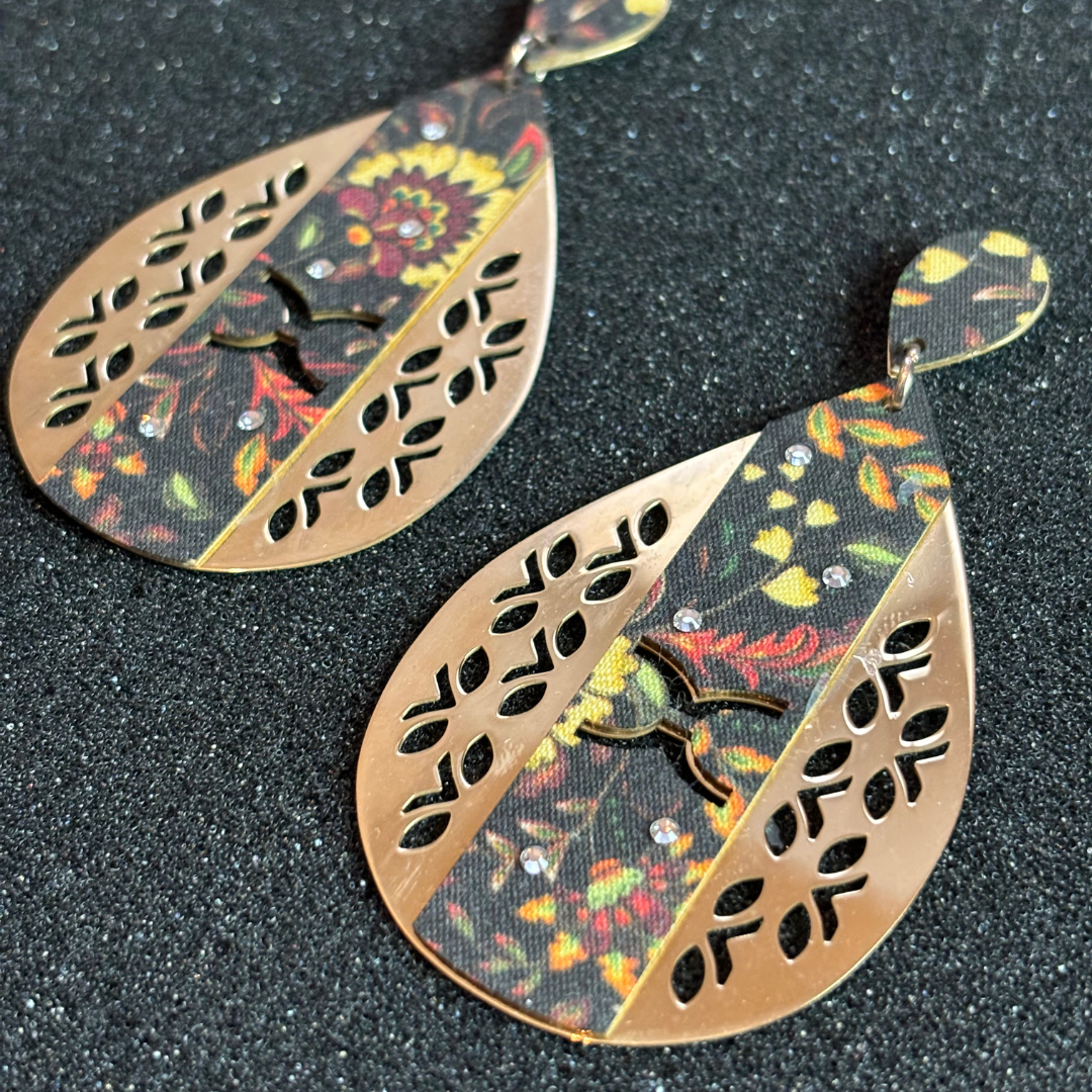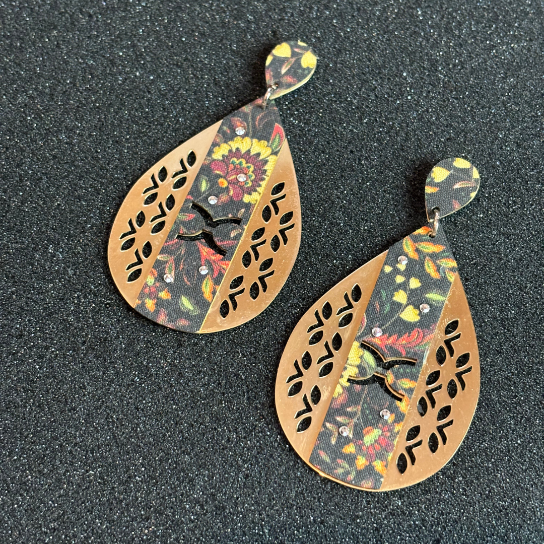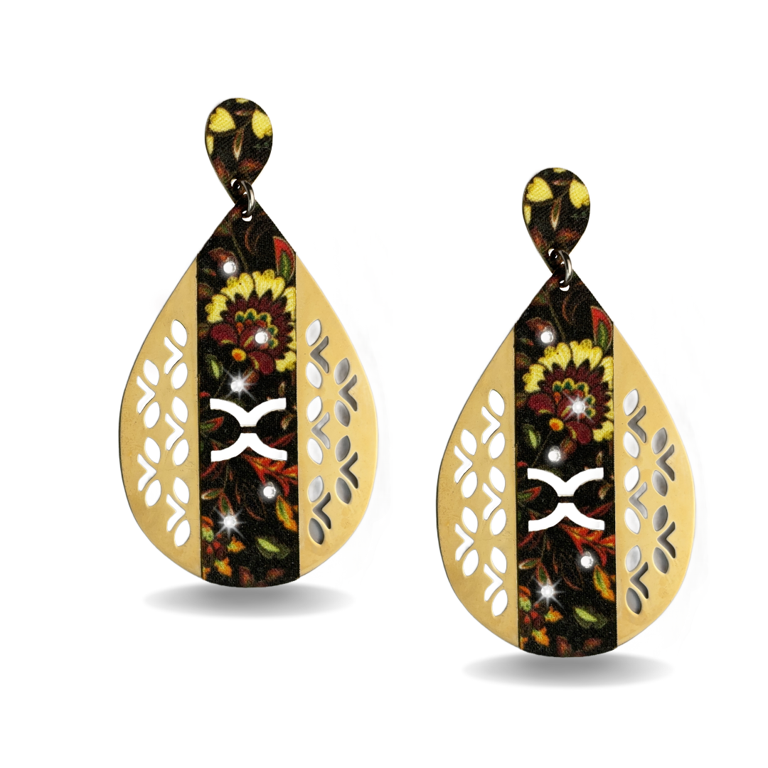 Elevate your style with our stunning earrings, crafted from high-quality silver and plated in luxurious gold. Each pair features original fabric with trendy patterns, expertly adhered to create a unique design. Adorned with sparkling Swarovski crystals and vibrant gemstones, these earrings add a touch of elegance and sophistication to any outfit. Perfect for any occasion, they are a statement piece that combines artistry and modern flair